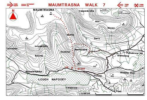 From the car park the walker should seek out the gate that leads onto the mountain side. A long steep climb leads to the ridge. Skeltia is indeterminately marked on the flat plateau and care should be exercised when descending the Maumtrasna Ridge. Once in the valley the bog roads are easy to follow using map and waymarkers. The intrepid climber who wants a challenge can proceed to Maumtrasna Mountain, again hardly distinguishable from it's plateau like surrounds. From here an arduous and very challenging descent may be made into the valley of the Srahnalong River and back to the road system. This part of the walk is only for the experienced and well attired walker and should not be attempted without some knowledge of scrambling techniques.